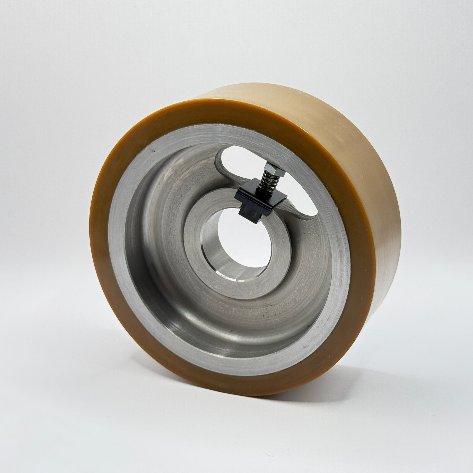 Original Weinig rubber feed roller or transport roller for use in Weinig planing and moulding machines, four-side planing machines or similar. The roller is used at the end of the processing to pull the finished workpiece out of the machine without damaging it.